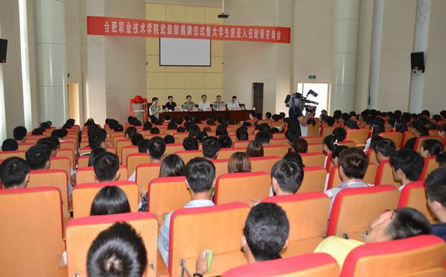 6月10日下午,我院在图书馆二楼报告厅举行合肥职业技术学院武装部成立揭牌仪式暨大学生应征入伍政策咨询会。会议由学院党委副书记胡其云主持,学院党委书记丁家康出席会议。巢湖市人武部部长许剑、政委章义苗、巢湖市民政局安置办主任杨国钧、巢湖市卫生局医政科科长鲁静、学院保卫处、各系(分院)学工人员、部分学生代表等参加了会议。