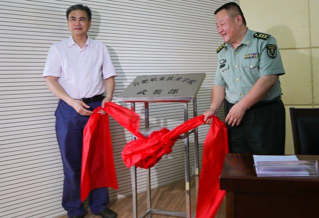 学院党委书记丁家康、巢湖市人武部部长许剑共同为“合肥职业技术学院武装部”标牌进行揭牌,宣告合肥职业技术学院武装部正式成立。